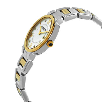 Stainless steel case with a two-tone (silver-tone and yellow gold-tone) stainless steel bracelet. Fixed yellow gold-tone bezel. Silver dial with yellow gold-tone hands and alternating Roman numeral and diamond hour markers. Minute markers around an inner ring. Dial Type: Analog. Date display at the 3 o'clock position. Quartz movement. Scratch resistant sapphire crystal. Pull / push crown. Solid case back. Round case shape. Case size: 30 mm. Fold over clasp with a push button release. Water resistant at 50 meters / 165 feet. Functions: date, hour, minute. Jasmine Series. Dress watch style. Watch label: Swiss Made. Raymond Weil Jasmine Quartz Diamond Silver Dial Ladies Watch 5240-STP-00665.