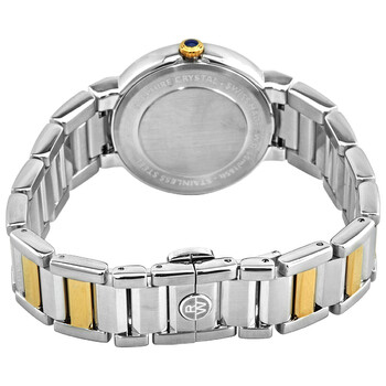 Two-tone (silver-tone and yellow gold-tone) stainless steel case and bracelet. Fixed yellow gold-tone stainless steel bezel. Silver dial with blue hands and alternating Roman numeral and index hour markers. Minute markers around an inner ring. Dial Type: Analog. Date display at the 3 o'clock position. Quartz movement. Scratch resistant sapphire crystal. Pull / push crown. Solid case back. Round case shape, case size: 35 mm. Fold over clasp with a push button release. Water resistant at 50 meters / 165 feet. Functions: date, hour, minute. Jasmine Series. Dress watch style. Watch label: Swiss Made. Raymond Weil Jasmine Quartz Silver Dial Ladies Watch 5245-STP-00661.