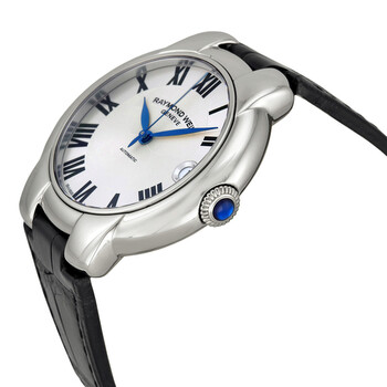 Stainless steel case with a black leather strap. Fixed bezel. Silver dial with blue hands and Roman numeral hour markers. Minute markers around the outer rim. Dial Type: Analog. Date display at the 3 o'clock position. Automatic movement. Scratch resistant sapphire crystal. Skeleton case back. Case diameter: 35 mm. Round case shape. Band length: 6 inches. Slip through clasp. Water resistant at 50 meters / 165 feet. Functions: date, hour, minute, second. Dress watch style. Watch label: Swiss Made. Raymond Weil Jasmine Silver Dial Black Leather Ladies Watch 2935-STC-00659.