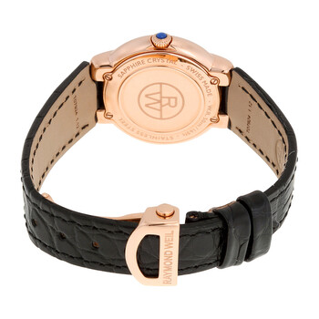 Rose gold PVD case with a black leather strap. Fixed rose gold PVD bezel. Silver dial with blue-tone hands and Roman numeral hour markers. Minute markers around an inner ring. Dial Type: Analog. Date display at the 3 o'clock position. Quartz movement. Scratch resistant Sapphire crystal. Pull/push crown with blue cabochon. Solid case back. Case diameter: 29 mm. Case thickness: 8 mm. Round case shape. Deployment clasp. Water resistant at 50 meters / 165 feet. Functions: date, hour, minute, second. Casual watch style. Watch label: Swiss Made. Raymond Weil Jasmine Silver Dial Black Leather Ladies Watch 5229-PC5-00659.