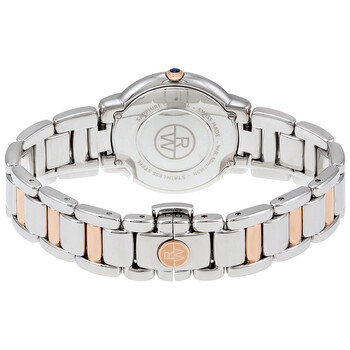 Stainless steel case with a two-tone (silver and rose gold-tone) stainless steel bracelet. Fixed stainless steel bezel set with diamonds. Silver dial with rose gold-tone hands and Roman numeral hour markers. Dial Type: Analog. Date display at the 3 o'clock position. Quartz movement. Scratch resistant sapphire crystal. Pull / push crown. Solid case back. Case diameter: 35 mm. Case thickness: 7.9 mm. Round case shape. Deployment clasp. Water resistant at 50 meters / 165 feet. Functions: date, hour, minute, second. Luxury watch style. Watch label: Swiss Made. Raymond Weil Jasmine Silver Dial Two-tone Diamond Ladies Watch 5235-S5S-01658.