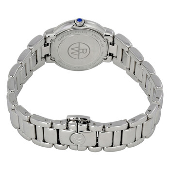 Stainless steel case with a stainless steel bracelet. Fixed stainless steel bezel. Silver dial with blue hands and Roman numeral hour markers. Minute markers around an inner circle. Dial Type: Analog. Date display appears at the 3 o'clock position. Quartz movement. Scratch resistant sapphire crystal. Solid case back. Case diameter: 29 mm. Case thickness: 7.75 mm. Round case shape. Band width: 14 mm. Band length: ladies standard. Deployment clasp with a push button release . Water resistant at 50 meters / 165 feet. Functions: date, hour, minute. Casual watch style. Watch label: Swiss Made. Raymond Weil Jasmine Silver Dial Stainless Steel Ladies Watch 5229-ST-00659.