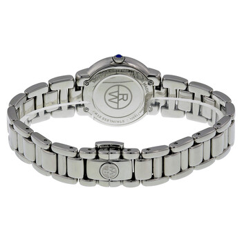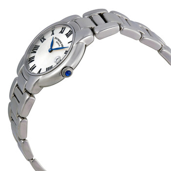 Stainless steel case with a stainless steel bracelet. Fixed stainless steel bezel. Silver dial with blue hands and Roman numeral hour markers. Dial Type: Analog. Date display at the 3 o'clock position. Quartz movement. Scratch resistant sapphire crystal. Pull / push crown. Solid case back. Case diameter: 29 mm. Case thicknesss: 7.75 mm. Round case shape. Band width: 17.8 mm. Band length: 7 inches. Deployment clasp. Water resistant at 50 meters / 165 feet. Functions: date, hour, minute. Casual watch style. Raymond Weil Jasmine Silver Dial Stainless Steel Ladies Watch 5229-ST-01659.