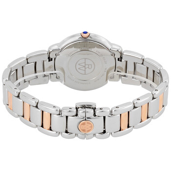 Stainless steel case with a two-tone (silver and rose gold PVD) stainless steel bracelet. Fixed stainless steel bezel. Silver dial with rose gold-tone hands and Roman numeral hour markers. Dial Type: Analog. Date display at the 3 o'clock position. Quartz movement. Scratch resistant sapphire crystal. Pull / push crown. Solid case back. Case diameter: 35 mm. Case thickness: 7.9 mm. Round case shape. Deployment clasp. Water resistant at 50 meters / 165 feet. Functions: date, hour, minute, second. Luxury watch style. Watch label: Swiss Made. Raymond Weil Jasmine Silver Dial Two Tone Stainless Steel Ladies Watch 5235-S5-01658.