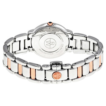 Stainless steel case with a stainless steel bracelet with rose gold PVD links. Fixed stainless steel bezel. Silver dial with blue hands and Roman numeral hour markers. Dial Type: Analog. Date display at the 3 o'clock position. Quartz movement. Scratch resistant sapphire crystal. Solid case back. Case diameter: 35 mm. Case thickness: 7.9 mm. Round case shape. Bracelet width: 19 mm. Deployment clasp with a push button release. Water resistant at 50 meters / 165 feet. Functions: date, hour, minute. Luxury watch style. Watch label: Swiss Made. Raymond Weil Jasmine Silver Dial Two Tone Stainless Steel Ladies Watch 5235-S5-01659.