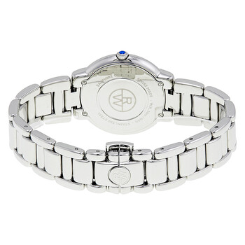 Stainless steel case with a stainless steel bracelet. Fixed stainless steel bezel. Silver dial with blue hands and Roman numeral hour markers. Dial Type: Analog. Date display at the 3 o'clock position. Quartz movement. Scratch resistant sapphire crystal. Pull / push crown. Solid case back. Case diameter: 35 mm. Case thickness: 8 mm. Round case shape. Band width: 20.3 mm. Band length: 8 inches. Hidden folding clasp. Water resistant at 50 meters / 165 feet. Functions: date, hour, minute,. Casual watch style. Watch label: Swiss Made. Raymond Weil Jasmine Silver Dial Stainless Steel Ladies Watch 5235-ST-01659.