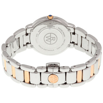 Stainless steel case with a two-tone (silver and rose gold-tone) stainless steel bracelet. Fixed stainless steel bezel. Silver dial with blue hands and Roman numeral hour markers. Minute markers around an inner ring. Dial Type: Analog. Date display at the 3 o'clock position. Quartz movement. Scratch resistant sapphire crystal. Solid case back. Case size: 35 mm. Case thickness: 7 mm. Round case shape. Band width: 19 mm. Band length: ladies standard. Deployment clasp with a push button release. Water resistant at 50 meters / 165 feet. Functions: date, hour, minute. Dress watch style. Watch label: Swiss Made. Item Variations: 5235 S5 00659, 5235.S5.00659, 5235S500659. Raymond Weil Jasmine Silver Dial Quartz Ladies Watch 5235-S5-00659.
