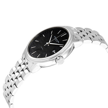 Stainless steel case with a stainless steel bracelet. Fixed stainless steel bezel. Black dial with silver-tone hands and index hour markers. Minute markers around the outer rim. Dial Type: Analog. Date display at the 3 o'clock position. Raymond Weil calibre RW 4200 automatic movement with a 38-hour power reserve. Scratch resistant sapphire crystal. Pull / push crown. Transparent case back. Round case shape. Case size: 39.5 mm. Case thickness: 9.2 mm. Band width: 18 mm. Fold over clasp with a double push-security sysem. Water resistant at 50 meters / 165 feet. Functions: date, hour, minute, second. Dress watch style. Watch label: Swiss Made. Raymond Weil Maestro Automatic Black Dial Men's Watch 2237-ST-20011.