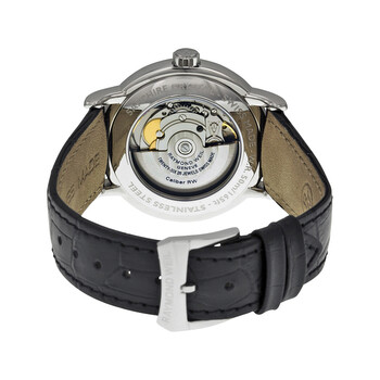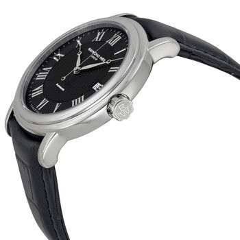 Stainless steel case with a black leather strap. Fixed stainless steel bezel. Black dial with silver-tone hands and Roman numeral hour markers. Minute markers around the outer rim. Dial Type: Analog. Date display at the 3 o'clock position. Automatic movement with a 38-hour power reserve. Scratch resistant sapphire crystal. Pull / push crown. Transparent case back. Case diameter: 39 mm. Case thickness: 9.15 mm. Round case shape. Band width: 19 mm. Tang clasp. Water resistant at 50 meters / 165 feet. Functions: date, hour, minute, second. Dress watch style. Raymond Weil Maestro Automatic Black Dial Black Leather Men's Watch 2837-STC-00208.