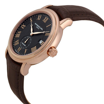18kt rose gold PVD stainless steel case with a brown leather strap. Fixed 18kt rose gold PVD bezel. Black dial with rose gold-tone hands and Roman numeral hour markers. Minute markers around the outer rim. Dial Type: Analog. Date display at the 3 o'clock position. Seconds sub-dial above the 6 o'clock position. Automatic movement with a 38-hour power reserve. Scratch resistant sapphire crystal. Pull / push crown. Transparent case back. Case diameter: 39.5 mm. Case thickness: 9.15mm. Round case shape. Strap width: 19 mm. Tang clasp. Water resistant at 50 meters / 165 feet. Functions: date, hour, minute, second. Casual watch style. Watch label: Swiss Made. Item Variations: 2838 PC5 00209, 2838.PC5.00209, 2838PC500209. Raymond Weil Maestro Automatic Black Dial Brown Leather Men's Watch 2838-PC5-00209.