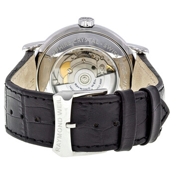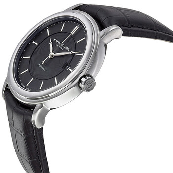 Stainless steel case with a black (croco-embossed) leather strap. Fixed stainless steel bezel. Black dial with silver-tone hands and index hour markers. Minute markers around the outer rim. Dial Type: Analog. Date display at the 3 o'clock position. Raymond Weil calibre RW 4200 automatic movement with a 38-hour power reserve. Scratch resistant sapphire crystal. Pull / push crown. Transparent case back. Round case shape. Case size: 41.5 mm. Case thickness: 9 mm. Band width: 21 mm. Band length: 9 inches. Tang clasp. Water resistant at 50 meters / 165 feet. Functions: date, hour, minute, second. Luxury watch style. Watch label: Swiss Made. Item Variations: 2847 STC 20001, 2847.STC.20001, 2847STC20001. Raymond Weil Maestro Automatic Black Dial Men's Watch 2847-STC-20001.