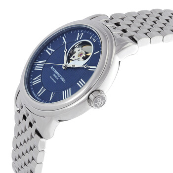 Silver-tone stainless steel case and bracelet. Fixed silver-tone stainless steel bezel. Blue dial with silver-tone hands and Roman numeral hour markers. Minute markers around the outer rim. Dial Type: Analog. Automatic movement. Scratch resistant sapphire crystal. Pull / push crown. Transparent case back. Round case shape, case size: 39.5 mm. Fold over clasp with a safety release. Water resistant at 50 meters / 165 feet. Functions: hour, minute, second. Maestro Series. Dress watch style. Watch label: Swiss Made. Raymond Weil Maestro Automatic Blue Dial Men's Watch 2827-ST-00508.