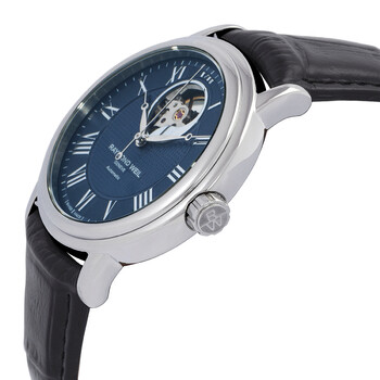 Silver-tone stainless steel case with a black leather strap. Fixed silver-tone stainless steel bezel. Blue dial with silver-tone hands and Roman numeral hour markers. Minute markers around the outer rim. Dial Type: Analog. Automatic movement. Scratch resistant sapphire crystal. Pull / push crown. Transparent case back. Round case shape, case size: 39.5 mm. Buckle clasp. Water resistant at 50 meters / 165 feet. Functions: hour, minute, second. Maestro Series. Dress watch style. Watch label: Swiss Made. Raymond Weil Maestro Automatic Blue Dial Men's Watch 2827-STC-00508.