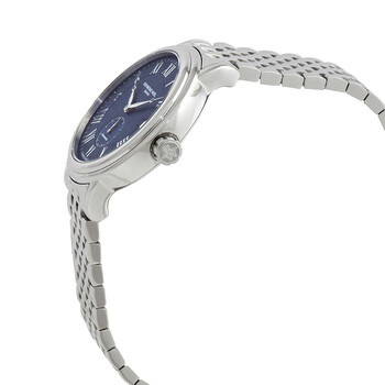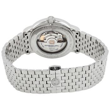 Silver-tone stainless steel case and bracelet. Fixed silver-tone stainless steel bezel. Blue dial with silver-tone hands and Roman numeral hour markers. Minute markers around the outer rim. Dial Type: Analog. Date display at the 3 o'clock position. Small second hand at 6 oclock subdials. Automatic movement. Scratch resistant sapphire crystal. Pull / push crown. Round case shape, case size: 39 mm. Water resistant at 50 meters / 165 feet. Functions: date, hour, minute, second. Maestro Series. Watch label: Swiss Made. Raymond Weil Maestro Automatic Blue Dial Men's Watch 2838-ST-00508.
