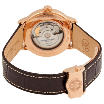 Rose gold PVD stainless steel case with a brown leather strap. Fixed rose gold PVD bezel. Grey dial with rose gold-tone hands and Arabic numeral hour markers. Minute markers around the outer rim. Dial Type: Analog. Date display at the 3 o'clock position. Automatic movement with a 38-hour power reserve. Scratch resistant sapphire crystal. Pull / push crown. Transparent case back. Round case shape. Case size: 40 mm. Case thickness: 9.2 mm. Fold over clasp. Water resistant at 50 meters / 165 feet. Functions: date, hour, minute, second. Maestro Series. Casual watch style. Watch label: Swiss Made. Raymond Weil Maestro Automatic Grey Dial Men's Watch 2237-PC5-05608.
