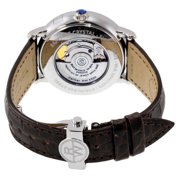 Stainless steel case with a dark brown leather strap. Fixed stainless steel bezel. Brown dial with gunmetal hands and alternating Arabic numeral and diamond hour markers. Minute markers. Date scale around the outer rim. Dial Type: Analog. Pointer date. Moonphase sub-dial at the 6 o'clock position. Automatic movement with a 38-hour power reserve. Scratch resistant sapphire crystal. Pull / push crown. Transparent case back. Case diameter: 36 mm. Case thickness: 7 mm. Round case shape. Band width: 15 mm. Fold over clasp. Water resistant at 50 meters / 165 feet. Functions: date, hour, minute, second, moonphase. Dress watch style. Watch label: Swiss Made. Item Variations: 2739 L2 05785, 2739.L2.05785, 2739L205785. Raymond Weil Maestro Automatic Brown Diamond Dial Dark Brown Leather Ladies Watch 2739-L2-05785.