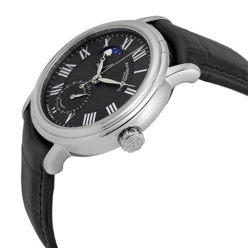 Stainless steel case with a black (calfskin) leather strap. Fixed stainless steel bezel. Black dial with silver-tone hands and Roman numeral hour markers. Minute markers around the outer rim. Dial Type: Analog. Date sub-dial at the 6 o'clock position. Moonphase display. Automatic movement with a 38-hour power reserve. Scratch resistant sapphire crystal. Pull / push crown. Skeleton case back. Case diameter: 39.5 mm. Case thickness: 11.6 mm. Round case shape. Band width: 20 mm. Tang clasp. Water resistant at 50 meters / 165 feet. Functions: date, hour, minute, second, moonphase. Casual watch style. Watch label: Swiss Made. Item Variations: 2839 STC 00209, 2839.STC.00209, 2839STC00209. Raymond Weil Maestro Black Dial Black Leather Men's Watch 2839-STC-00209.