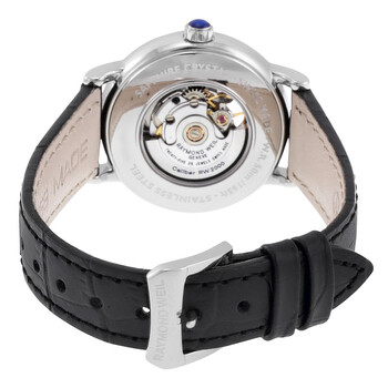Silver-tone stainless steel case with a black leather strap. Fixed silver-tone stainless steel bezel. Mother of pearl dial with silver-tone Breguet-style shape hands and alternating Roman numeral and diamond hour markers. Minute markers around the outer rim. Dial Type: Analog. One - open heart subdial. Raymond Weil Calibre RW 2000 Automatic movement, containing 25 Jewels, bitting at 28800 vph, and has a power reserve of approximately 38 hours. Scratch resistant sapphire crystal. Pull / push crown. Screw down case back. Round case shape, case size: 30 mm, case thickness: 9 mm. Band width: 15 mm, band length: 6.5 inches. Tang clasp. Water resistant at 50 meters / 165 feet. Functions: hour, minute, second. Maestro Series. Luxury watch style. Watch label: Swiss Made. Item Variations: 2627 STC 00965, 2627.STC.00965, 2627STC00965. Raymond Weil Maestro Automatic Mother of Pearl Dial Ladies Watch 2627-STC-00965.