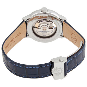 Stainless steel case with a blue (calfskin) leather strap. Fixed stainless steel bezel. Salmon pink (open heart) dial with blue hands and Roman numeral hour markers. Minute markers around the outer rim. Dial Type: Analog. Open balance wheel at 12 o'clock movement. Automatic movement with a 38-hour power reserve. Scratch resistant sapphire crystal. Pull / push crown. Transparent case back. Round case shape. Case size: 40 mm. Case thickness: 9.2 mm. Band width: 20 mm. Fold over clasp. Water resistant at 50 meters / 165 feet. Functions: hour, minute, second. Maestro Series. Dress watch style. Watch label: Swiss Made. Raymond Weil Maestro Automatic Salmon Pink Dial Men's Watch 2227 -STC-00808.