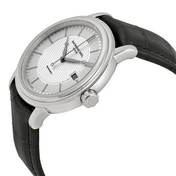 Stainless steel case with a black leather strap. Fixed stainless steel bezel. Silver dial with silver-tone hands and index hour markers. Minute markers around the outer rim. Dial Type: Analog. Date display at the 3 o'clock position. Automatic movement. Scratch resistant sapphire crystal. Pull / push crown. Skeleton case back. Case diameter: 39.5 mm. Case thickness: 9.15 mm. Round case shape. Strap width: 20 mm. Tang clasp. Water resistant at 50 meters / 165 feet. Functions: date, hour, minute, second. Dress watch style. Watch label: Swiss Made. Raymond Weil Maestro Silver Dial Black Leather Men's Watch 2837-STC-65001.