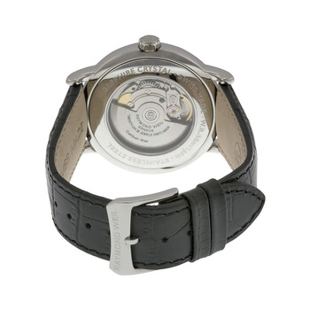 Silver-tone stainless steel case with a black calfskin leather strap. Fixed silver-tone stainless steel bezel. Silver dial with blue Breguet-style shape hands and Roman numeral hour markers. Minute markers around the outer rim. Dial Type: Analog. Date display at the 3 o'clock position. Automatic movement with a 38-hour power reserve. Scratch resistant sapphire crystal. Pull / push crown. Transparent case back. Round case shape, case size: 41.5 mm, case thickness: 9 mm. Band width: 21 mm, band length: 7.5 inches. Tang clasp. Water resistant at 50 meters / 165 feet. Functions: date, hour, minute, second. Maestro Series. Luxury watch style. Watch label: Swiss Made. Item Variations: 2847 STC 00659, 2847.STC.00659, 2847STC00659. Raymond Weil Maestro Automatic Silver Dial Black Leather Men's Watch 2847-STC-00659.