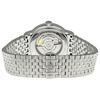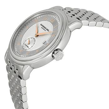 Stainless steel case with a stainless steel bracelet. Fixed stainless steel bezel. Silver dial with rose gold-tone hands and Arabic numeral hour markers. Minute markers around the outer rim. Dial Type: Analog. Date display at the 3 o'clock position. Seconds sub-dial above the 6 o'clock position. Automatic movement with a 38-hour power reserve. Scratch resistant sapphire crystal. Pull / push crown. Skeleton case back. Case diameter: 39.5 mm. Case thickness: 9.95 mm. Round case shape. Band width: 20mm. Band length: 7 inches. Deployment clasp. Water resistant at 50 meters / 165 feet. Functions: date, hour, minute, second. Luxury watch style. Watch label: Swiss Made. Raymond Weil Maestro Automatic Silver Dial Stainless Steel Men's Watch 2838-S5-05658.