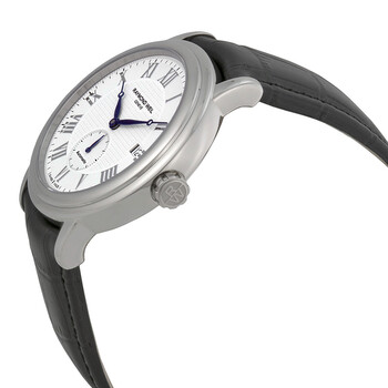 Silver-tone stainless steel case with a black croco-embossed leather strap. Fixed silver-tone stainless steel bezel. Silver dial with blue Breguet-style shape hands and Roman numeral hour markers. Minute markers around the outer rim. Dial Type: Analog. Luminescent hands and markers. Date display at the 3 o'clock position. Seconds subdials. Automatic movement with a 38-hour power reserve. Scratch resistant sapphire crystal. Cabochon crown. Skeleton case back. Round case shape, case size: 39 mm, case thickness: 10.3 mm. Band width: 19 mm. Tang clasp. Water resistant at 50 meters / 165 feet. Functions: hours, minutes, seconds, date. Additional Info: suitable for swimming and showering. Maestro Series. Casual watch style. Watch label: Swiss Made. Item Variations: 2838 STC 00308, 2838.STC.00308, 2838STC00308. Raymond Weil Maestro Automatic Silver Dial Men's Watch 2838-STC-00308.