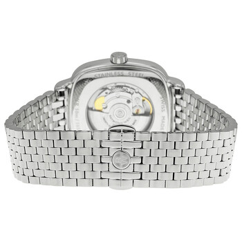 Stainless steel case with a stainless steel bracelet. Fixed stainless steel bezel. Silver dial with blue hands and Roman numeral hour markers. Minute markers around the outer rim. Dial Type: Analog. Date display at the 3 o'clock position. Automatic movement with a 38-hour power reserve. Scratch resistant sapphire crystal. Pull / push crown. Skeleton case back. Case diameter: 40 mm. Case thickness: 9 mm. Square case shape. Band width: 20 mm. Band length: 8 inches. Deployment clasp. Water resistant at 50 meters / 165 feet. Functions: date, hour, minute, second. Luxury watch style. Watch label: Swiss Made. Item Variations: 2867 ST 00659, 2867.ST.00659, 2867ST00659. Raymond Weil Maestro Automatic Silver Dial Stainless Steel Men's Watch 2867-ST-00659.