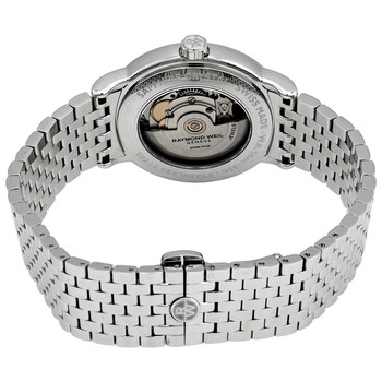 Mens Silver-tone stainless steel case and bracelet. Fixed silver-tone stainless steel bezel. Silver dial with silver-tone hands and index hour markers. Minute markers around the outer rim. Dial Type: Analog. Date display at the 3 o'clock position. Raymond Weil Calibre RW 4200 Automatic movement, based upon Sellita SW-200, containing 25 Jewels, bitting at 28800 vph, and has a power reserve of approximately 38 hours. Scratch resistant sapphire crystal. Pull / push crown. Transparent case back. Round case shape, case size: 39.5 mm, case thickness: 9.2 mm. Band width: 20 mm. Fold over clasp with a push button release. Water resistant at 50 meters / 165 feet. Functions: date, hour, minute, second. Maestro Series. Casual watch style. Watch label: Swiss Made. Raymond Weil Maestro Automatic Silver Dial Watch 2837-ST-65001.