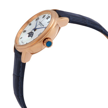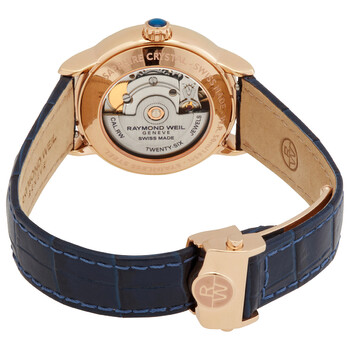 Rose gold PVD stainless steel case with a blue leather strap. Fixed rose gold PVD bezel. White mother of pearl dial with blue hands and Arabic numeral hour markers. Minute markers around the outer rim. Dial Type: Analog. Date display at the 3 o'clock position. Moonphase display. Automatic movement with a 38-hour power reserve. Scratch resistant sapphire crystal. Pull / push crown. Transparent case back. Round case shape. Case size: 34 mm. Case thickness: 9.8 mm. Strap width: 16 mm. Fold over clasp with a push button release. Water resistant at 50 meters / 165 feet. Functions: date, hour, minute, second. Maestro Series. Dress watch style. Watch label: Swiss Made. Raymond Weil Maestro Automatic White Mother of Pearl Dial Ladies Watch 2139-P53-05909.