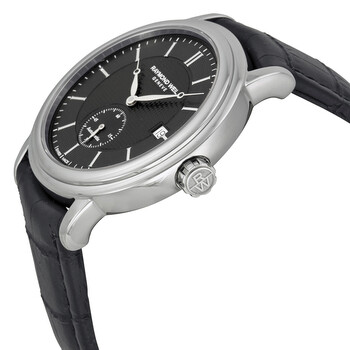Stainless steel case with a black(pigskin) leather strap. Fixed stainless steel bezel. Black dial with silver-toned hands and index hour markers. Minute markers around the outer rim. Dial Type: Analog. Date display at the 3 o'clock position. Seconds sub-dial at the 6 o'clock position. Automatic movement with a 38-hour power reserve. Scratch resistant sapphire crystal. Pull / push crown. Skeleton case back. Case diameter: 39.50 mm. Case thickness: 9.95 mm. Round case shape. Band width: 20 mm. Tang clasp. Water resistant at 50 meters / 165 feet. Functions: date, hour, minute, second. Luxury watch style. Watch label: Swiss Made. Item Variations: 2838 STC 20001, 2838.STC.20001, 2838STC20001. Raymond Weil Maestro Black Dial Black Leather Men's Watch 2838-STC-20001.