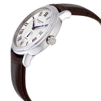 Silver-tone stainless steel case with a brown leather strap. Fixed silver-tone stainless steel bezel. Silver dial with blue Breguet-style shape hands and black Roman numeral hour markers. Minute markers around the outer rim. Dial Type: Analog. Luminescent hands and markers. Date display at the 3 o'clock position. Small seconds sub-dial above the 6 o'clock position subdials. Automatic movement with a 38-hour power reserve. Scratch resistant sapphire crystal. Fluted steel crown. Skeleton case back. Round case shape, case size: 40 mm, case thickness: 10 mm. Tang clasp. Water resistant at 50 meters / 165 feet. Functions: date, hour, minute, second. Maestro Series. Dress watch style. Watch label: Swiss Made. Item Variations: 2838 STC 00659 BR, 2838.STC.00659.BR, 2838STC00659BR. Raymond Weil Maestro Brown Leather Men's Watch 2838-STC-00659.