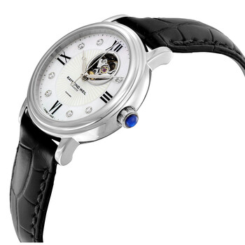 Silver-tone stainless steel case with a black leather strap. Fixed silver-tone stainless steel bezel. Mother of pearl with skeletal diaplay dial with silver-tone hands and diamond hour markers. Roman numerals mark the 3, 6, 9 and 12 o'clock positions. Dial Type: Analog. One - open heart subdial. Raymond Weil Calibre RW 2000 Automatic movement, containing 25 Jewels, bitting at 28800 vph, and has a power reserve of approximately 38 hours. Scratch resistant sapphire crystal. Pull / push crown. Skeleton case back. Round case shape, case size: 30 mm, case thickness: 8.7 mm. Band width: 15 mm, band length: 6.5 inches. Tang clasp. Water resistant at 50 meters / 165 feet. Functions: hour, minute, second. Maestro Series. Luxury watch style. Watch label: Swiss Made. Item Variations: 2627 STC 00994, 2627.STC.00994, 2627STC00994. Raymond Weil Maestro Mother of Pearl Dial Ladies Watch 2627-STC-00994.