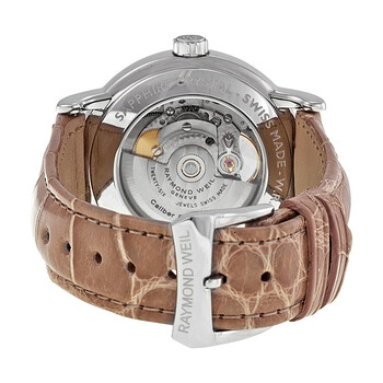 Stainless steel case with a beige alligator leather strap. Fixed stainless steel bezel. Mother of pearl dial (with an open heart display) with silver-tone hands and Roman numeral and diamond hour markers. Minute markers around the outer rim. Dial Type: Analog. Raymond Weil calibre RW 4200 automatic movement with a 38-hour power reserve. Scratch resistant sapphire crystal. Pull / push crown. Transparent case back. Case size: 39.5 mm. Case thickness: 13.9 mm. Round case shape. Band width: 19 mm. Band length: 7 inches. Tang clasp. Water resistant at 50 meters / 165 feet. Functions: hour, minute, second, open escapement window. Dress watch style. Watch label: Swiss Made. Item Variations: 2827 L4 00966, 2827.L4.00966, 2827L400966. Raymond Weil Maestro Mother of Pearl Dial Ladies Watch 2827-L4-00966.