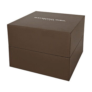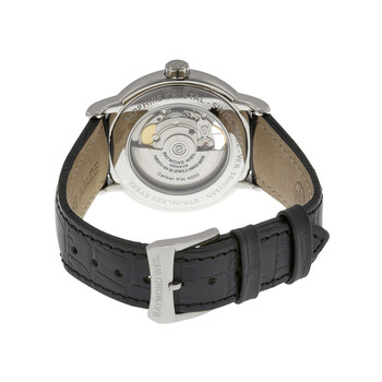 Stainless steel case with a black (calfskin) leather strap. Fixed stainless steel bezel. Silver dial (with an open balance wheel display) dial with blue hands and Roman numeral hour markers. Minute markers around the outer rim. Dial Type: Analog. Luminescent hands and markers. Raymond Weil calibre RW4200 automatic movement with a 38-hour power reserve. Scratch resistant sapphire crystal. Pull / push crown. Skeleton case back. Case size: 40 mm. Case thickness: 11 mm. Round case shape. Band width: 20 mm. Tang clasp. Water resistant at 50 meters / 165 feet. Functions: hour, minute, second. Casual watch style. Watch label: Swiss Made. Item Variations: 2827 STC 00659, 2827.STC.00659, 2827STC00659. Raymond Weil Maestro Silver Dial Men's Watch 2827-STC-00659.