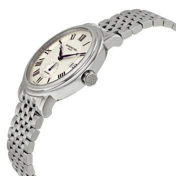 Stainless steel case with a stainless steel bracelet. Fixed stainless steel bezel. Silver dial with blue-toned hands and Roman numeral hour markers. Minute markers around the outer rim. Dial Type: Analog. Date display at the 3 o'clock position. Seconds sub-dial above the 6 o'clock position. Automatic movement. Scratch resistant sapphire crystal. Pull / push crown. Transparent case back. Case diameter: 39.5 mm. Case thickness: 9.95 mm. Round case shape. Band width: 20.3 mm. Band length: 8 inches. Double push button folding clasp. Water resistant at 50 meters / 165 feet. Functions: date, hour, minute, second. Luxury watch style. Watch label: Swiss Made. Raymond Weil Maestro Silver Dial Stainless Steel Automatic Men's Watch 2838-ST-00659.