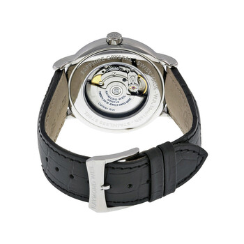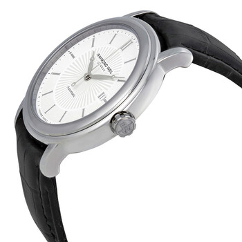 Stainless steel case with a black leather strap. Fixed stainless steel bezel. White dial with silver-tone hands and index hour markers. Minute markers around the outer rim. Dial Type: Analog. Date display at the 3 o'clock position. Automatic movement with a 38-hour power reserve. Scratch resistant sapphire crystal. Pull / push crown. Skeleton case back. Case diameter: 41.5 mm. Case thickness: 9.2 mm. Round case shape. Band width: 20.3 mm. Band length: 8 inches. Tang clasp. Water resistant at 50 meters / 165 feet. Functions: date, hour, minute, second. Dress watch style. Watch label: Swiss Made. Item Variations: 2847 STC 30001, 2847.STC.30001, 2847STC30001. Raymond Weil Maestro White Dial Black Leather Men's Watch 2847-STC-30001.