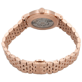 Rose gold PVD stainless steel case and bracelet. Fixed rose gold PVD stainless steel bezel. Burgundy dial with rose gold-tone hands and index hour markers. Minute markers around the outer rim. Dial Type: Analog. Luminescent hands and markers. Raymond Weil Calibre RW4200 automatic movement with a 41-hour power reserve. Scratch resistant sapphire crystal. Pull / push crown. Transparent case back. Round case shape, case size: 35 mm. Fold over clasp with a safety release. Water resistant at 50 meters / 165 feet. Functions: hour, minute, second. Millesime Series. Casual watch style. Watch label: Swiss Made. Raymond Weil Millesime Automatic Burgundy Dial Ladies Watch 2125-P5-45001.