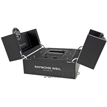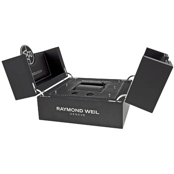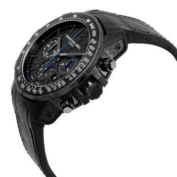 Black PVD titanium case with a black (crocodile) leather strap. Fixed black PVD bezel showing tachymeter markings. Black dial with luminous grey hands and index hour markers. An Arabic numeral marks the 12 o'clock position. Minute markers around the outer rim. Dial Type: Analog. Luminescent hands and markers. Date display between the 4 and 5 o'clock positions. Chronograph - three sub-dials displaying: 60 second, 30 minute and 12 hour. Automatic movement with a 44-hour power reserve. Scratch resistant sapphire crystal. Solid case back. Case diameter: 46 mm. Case thickness: 15mm. Round case shape. Deployment clasp. Water resistant at 200 meters / 660 feet. Functions: chronograph, tachymeter, date, hour, minute, second. Luxury watch style. Watch label: Swiss Made. Item Variations: 7810 BSF 05207, 7810.BSF.05207, 7810BSF05207. Raymond Weil Nabucco Automatic Chronograph Men's Watch 7810-BSF-05207.