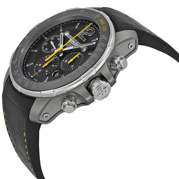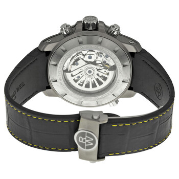 Silver-tone titanium case with a black rubber strap. Fixed titanium bezel with a black ceramic top ring showing tachymeter markings. Black dial with luminous hands and index hour markers. An Arabic numeral marks the 12 o'clock position. Minute markers around the outer rim. Dial Type: Analog. Luminescent hands and markers. Date display between the 4 and 5 o'clock positions. Chronograph - three sub-dials displaying: 60 second, 30 minute and 12 hour. Automatic movement with a 46-hour power reserve. Scratch resistant sapphire crystal. Screw down crown. Skeleton case back. Round case shape, case size: 46 mm, case thickness: 15.25 mm. Band width: 23 mm, band length: 8 inches. Deployment clasp. Water resistant at 200 meters / 660 feet. Functions: chronograph, date, hour, minute, second, tachymeter. Casual watch style. Watch label: Swiss Made. Item Variations: 7850 TIR 05207, 7850.TIR.05207, 7850TIR05207. Raymond Weil Nabucco Automatic Chronograph Men's Watch 7850-TIR-05207.