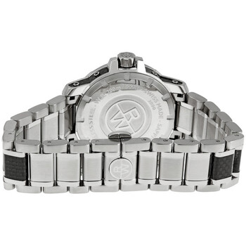 Stainless steel case with a stainless steel bracelet with black carbon fiber center. Fixed stainless steel bezel with GMT markings. Black dial with luminous silver-tone hands and stick hour markers. Arabic numerals mark the 6 and 12 o'clock positions. Minute markers around the outer rim. Luminescent hands and markers. Date displays between the 4 and 5 o'clock position. Automatic movement. Scratch resistant sapphire crystal. Solid case back. Case diameter: 44 mm. Case thickness: 13 mm. Double folding push button clasp. Water resistant at 200 meters / 660 feet. Functions: hours, minutes, seconds, date. Raymond Weil Nabucco Men's Watch 3800-SCF-05207. Note: This item comes in a generic watch box as shown in the picture.