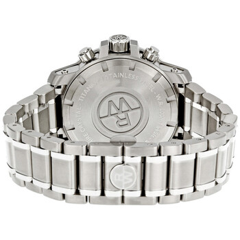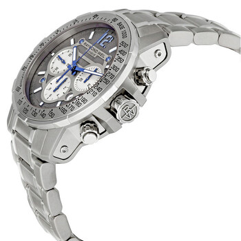 Titanium and stainless steel case and bracelet. Fixed titanium bezel with tachymeters. Dark gray dial with luminous hands and index hour markers. Atabic numeral marks the 12 o'clock position. Minute markers around the outer rim. Luminescent hands and hour markers. Date display between 4 and 5 o'clock position. Chronograph - three sub-dials displaying: 60 seconds, 30 minutes and 12 hours. Automatic movement. Scratch resistant sapphire crystal. Screw down crown. Solid case back. Case diameter: 46 mm. Case thickness: 15 mm. Deployment clasp. Water resistant at 200 meters / 660 feet. Functions: chronograph, tachometer, date, hour, minute, second. Raymond Weil Nabucco Men's Watch 7800-TI-05607.