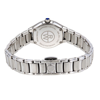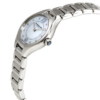 Silver-tone stainless steel case with a silver-tone stainless steel bracelet. Fixed silver-tone stainless steel bezel. Mother of pearl dial with silver-tone hands and diamond hour markers. Roman numerals mark the 6 and 12 o'clock positions. minute markers around an inner ring. Dial Type: Analog. Quartz movement. Scratch resistant sapphire crystal. Blue lacquered crown. Solid case back. Round case shape, case size: 24 mm, case thickness: 7 mm. Band width: 17.8 mm, band length: 7 inches. Fold over with push button release clasp. Water resistant at 50 meters / 165 feet. Functions: hour, minute, second. Noemia Series. Dress watch style. Watch label: Swiss Made. Item Variations: 5124 ST 00985, 5124.ST.00985, 5124ST00985. Raymond Weil Noemia Mother of Pearl Dial Ladies Watch 5124-ST-00985.
