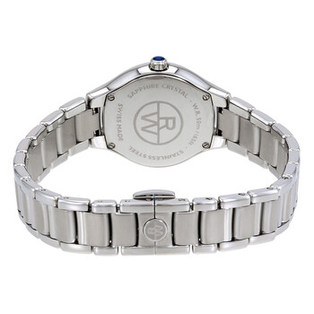 Stainless steel case with a stainless steel bracelet. Fixed stainless steel bezel. Mother of pearl dial with silver-tone hands and diamond hour markers. Roman numerals mark the 6 and 12 o'clock positions. Minute markers around an inner ring. Dial Type: Analog. Quartz movement. Scratch resistant sapphire crystal. Pull / push crown. Solid case back. Case size: 27 mm. Case thickness: 7 mm. Round case shape. Band width: 14 mm. Hidden fold over clasp. Water resistant at 50 meters / 165 feet. Functions: hour, minute. Dress watch style. Watch label: Swiss Made. Item Variations: 5127 ST 00985, 5127.ST.00985, 5127ST00985. Raymond Weil Noemia Mother of Pearl Dial Ladies Watch 5127-ST-00985.