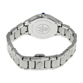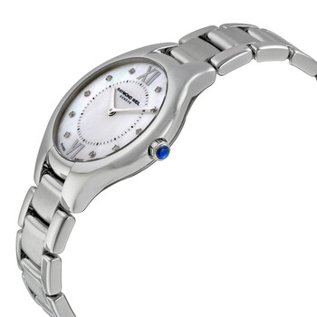 Stainless steel case with a stainless steel bracelet. Fixed stainless steel bezel. Mother of pearl dial with silver-toned hands and diamond hour markers. Roman numerals mark the 6 and 12 o'clock positions. Minute markers around an inner ring. Dial Type: Analog. Quartz movement. Scratch resistant sapphire crystal. Pull / push crown. Solid case back. Case diameter: 32 mm. Case thickness: 7.6 mm. Round case shape. Bracelet width: 18 mm. Double push button folding clasp. Water resistant at 50 meters / 165 feet. Functions: hour, minute. Dress watch style. Watch label: Swiss Made. Raymond Weil Noemia Mother of Pearl Diamond Dial Stainless Steel Ladies Watch 5132-ST-00985.