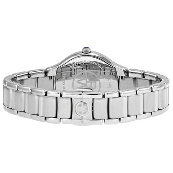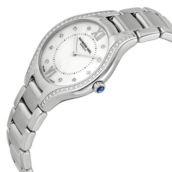 Stainless steel case with a stainless steel bracelet. Fixed stainless steel bezel set with diamonds. Mother of pearl dial with silver-toned hands and diamond hour markers. Roman numerals mark the 6 and 12 o'clock positions. Minute markers around an inner ring. Dial Type: Analog. Quartz movement. Scratch resistant sapphire crystal. Pull / push blue lacquered crown. Solid case back. Case diameter: 32 mm. Case thickness: 7.6 mm. Round case shape. Band width: 16 mm. Band length: 7 inches. Double push button fold over clasp. Water resistant at 50 meters / 165 feet. Functions: hour, minute. Dress watch style. Watch label: Swiss Made. Raymond Weil Noemia Mother of Pearl Dial Stainless Steel Diamond Ladies Watch 5132-STS-00985.