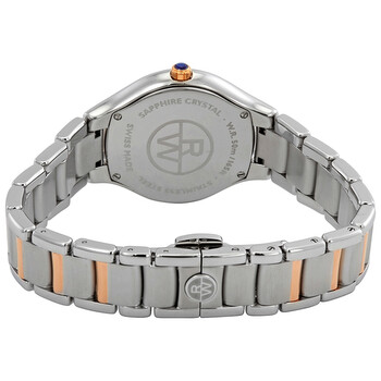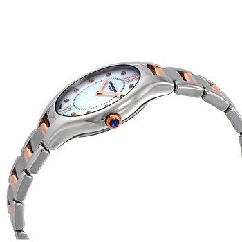 Stainless steel case with a two-tone (silver-tone and rose gold PVD) stainless steel bracelet. Fixed stainless steel bezel. White mother of pearl dial with rose gold-tone hands and diamond hour markers. Roman numerals mark the 6 and 12 o'clock positions. Minute markers. Dial Type: Analog. Luminescent hands and markers. Quartz movement. Scratch resistant sapphire crystal. Screw down crown. Solid case back. Round case shape. Case size: 32 mm. Case thickness: 7.58 mm. Band width: 16 mm. Fold over clasp. Water resistant at 50 meters / 165 feet. Functions: hour, minute. Additional Info: set of 10 diamonds on dial (.06 ct). Dress watch style. Watch label: Swiss Made. Raymond Weil Noemia Mother of Pearl Diamond Dial Ladies Two Tone Watch 5132-SP5-00985.