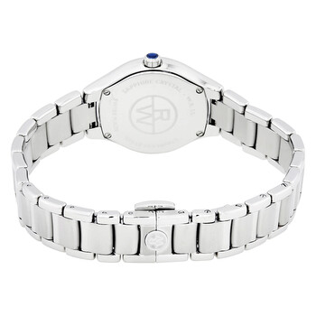 Stainless steel case with a stainless steel bracelet. Fixed stainless steel bezel set with diamonds. White mother of pearl dial with silver-tone hands and diamond hour markers. Roman numeral marks the 6 and 12 o'clock positions. Minute markers around the inner ring. Dial Type: Analog. Quartz movement. Scratch resistant anti-reflective sapphire crystal. Pull / push crown. Solid case back. Case size: 27 mm. Case thickness: 7.15 mm. Round case shape. Band width: 12 mm. Deployment clasp. Water resistant at 50 meters / 165 feet. Functions: hour, minute. Additional Info: in general, suitable for short periods of recreational swimming, but not diving or snorkeling. Luxury watch style. Watch label: Swiss Made. Item Variations: 5127 STS 00985, 5127.STS.00985, 5127STS00985. Raymond Weil Noemia Mother of Pearl Diamond Dial Ladies Watch 5127-STS-00985.