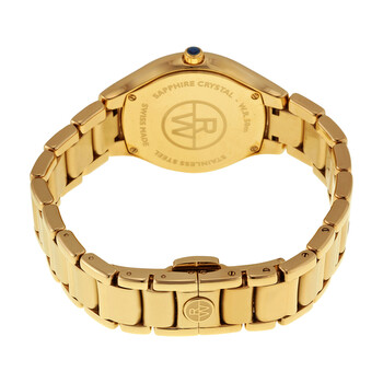 Yellow gold-plated stainless steel case and bracelet. Fixed yellow gold-plated bezel. White mother of pearl dial with gold-tone hands and diamond hour markers. Roman numerals mark the 6 and 12 o'clock positions. Minute markers around the inner ring. Dial Type: Analog. Quartz movement. Scratch resistant anti-reflective sapphire crystal. Pull / push crown. Solid case back. Case diameter: 32 mm. Case thickness: 7.58 mm. Round case shape. Band width: 14 mm. Deployment clasp. Water resistant at 50 meters / 165 feet. Functions: hour, minute. Luxury watch style. Watch label: Swiss Made. Raymond Weil Noemia Mother of Pearl Diamond Dial Ladies Watch 5132-P-00985.