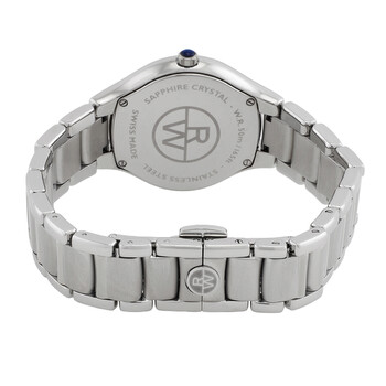 Silver-tone stainless steel case and bracelet. Fixed silver-tone stainless steel bezel. Blue mother of pearl dial with silver-tone hands and index hour markers. Minute markers around the inner ring. Dial Type: Analog. Quartz movement. Scratch resistant sapphire crystal. Pull / push crown. Solid case back. Round case shape, case size: 32 mm, case thickness: 7.6 mm. Band width: 16 mm. Fold over clasp with a push button release. Water resistant at 50 meters / 165 feet. Functions: hour, minute. Noemia Series. Dress watch style. Watch label: Swiss Made. Raymond Weil Noemia Quartz Blue Mother of Pearl Dial Ladies Watch 5132-ST-97501.